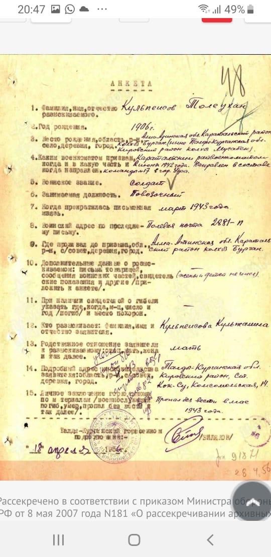 Место призыва: Каратальский РВК, Казахская ССР, Алма-Атинская обл., Каратальский р-н 02.06.1942